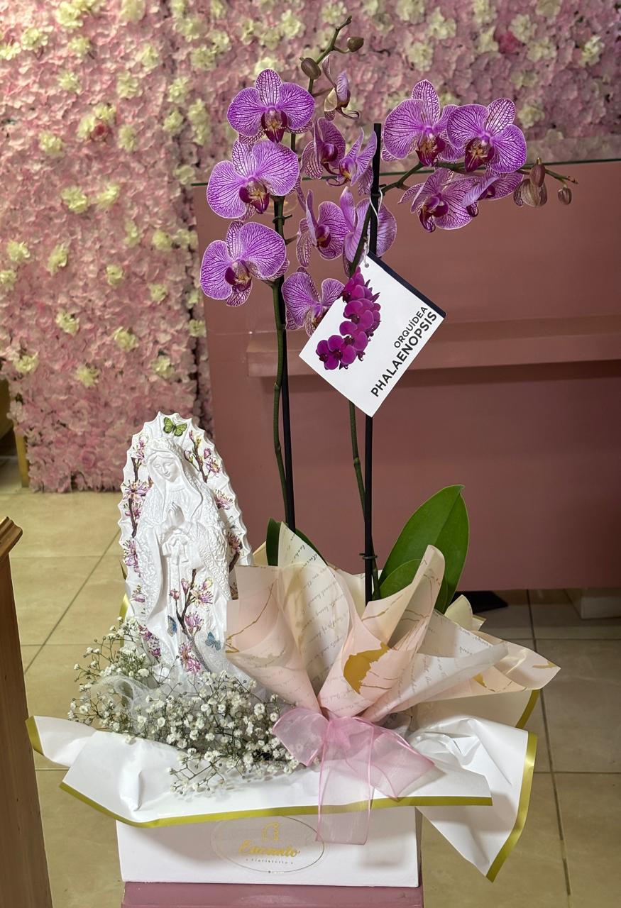 Una caja de madera rectangular con una Virgencita y una planta de orquidea falenopsis natural, adornada con yipsophilia y papeles koreano.