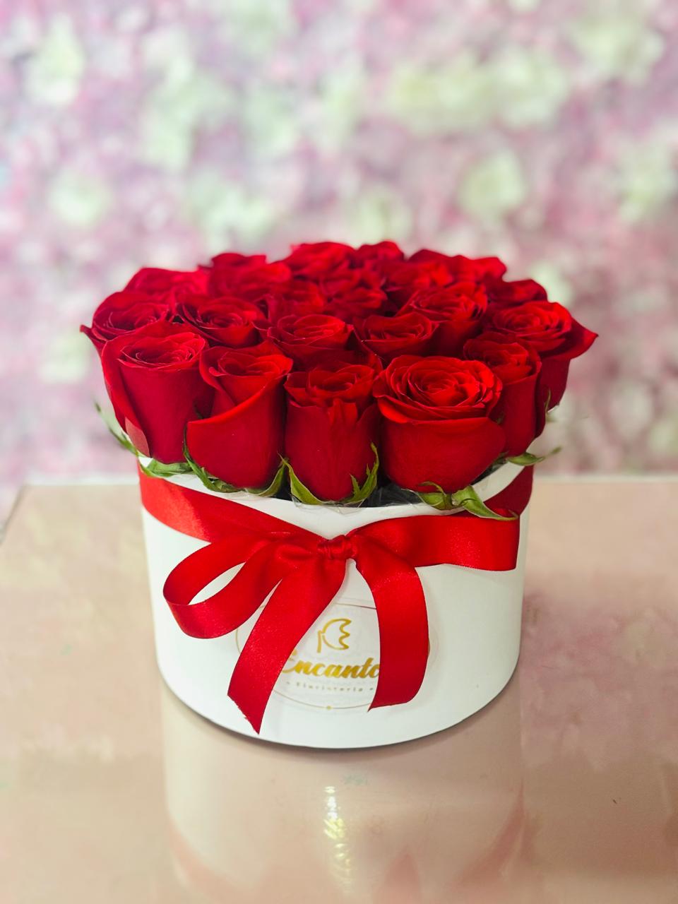 Caja dura con 20-22 rosas rojas al mismo nivel con un lazo moño cinta de raso