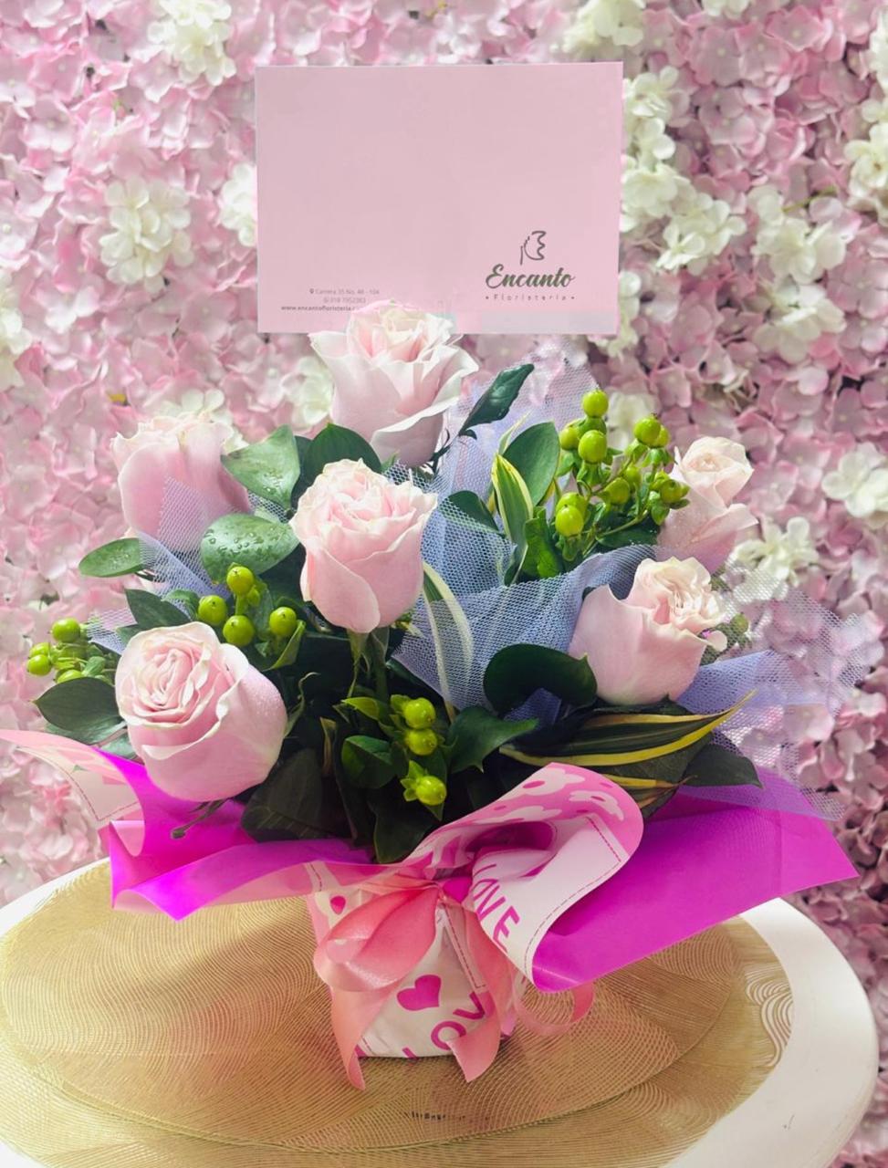 Arreglo con un contenedor para hidratación empacado con papel koreano,moño cinta de raso, 8 rosas, hipérico, canción de la india, tules, rusco .