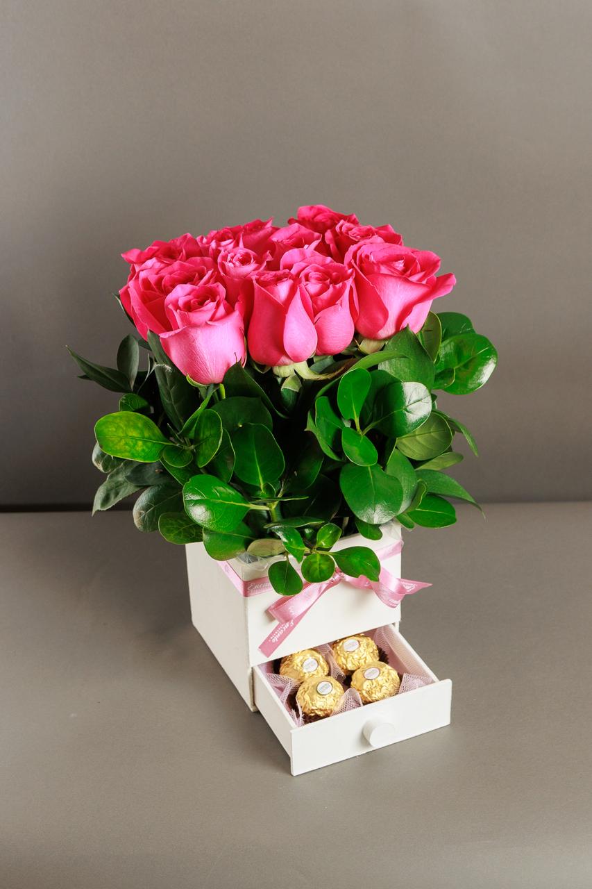 Lindo cofre con 12 rosas fucsias al mismo nivel, finos follajes , 4 chocolates ferrero rocher