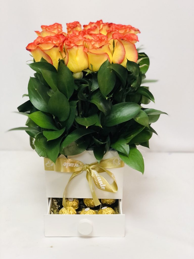 cofres de madera con cinta de raso, 12 rosas a nivel amarilla confetti , rusco, 6 chocolates ferrero rocher