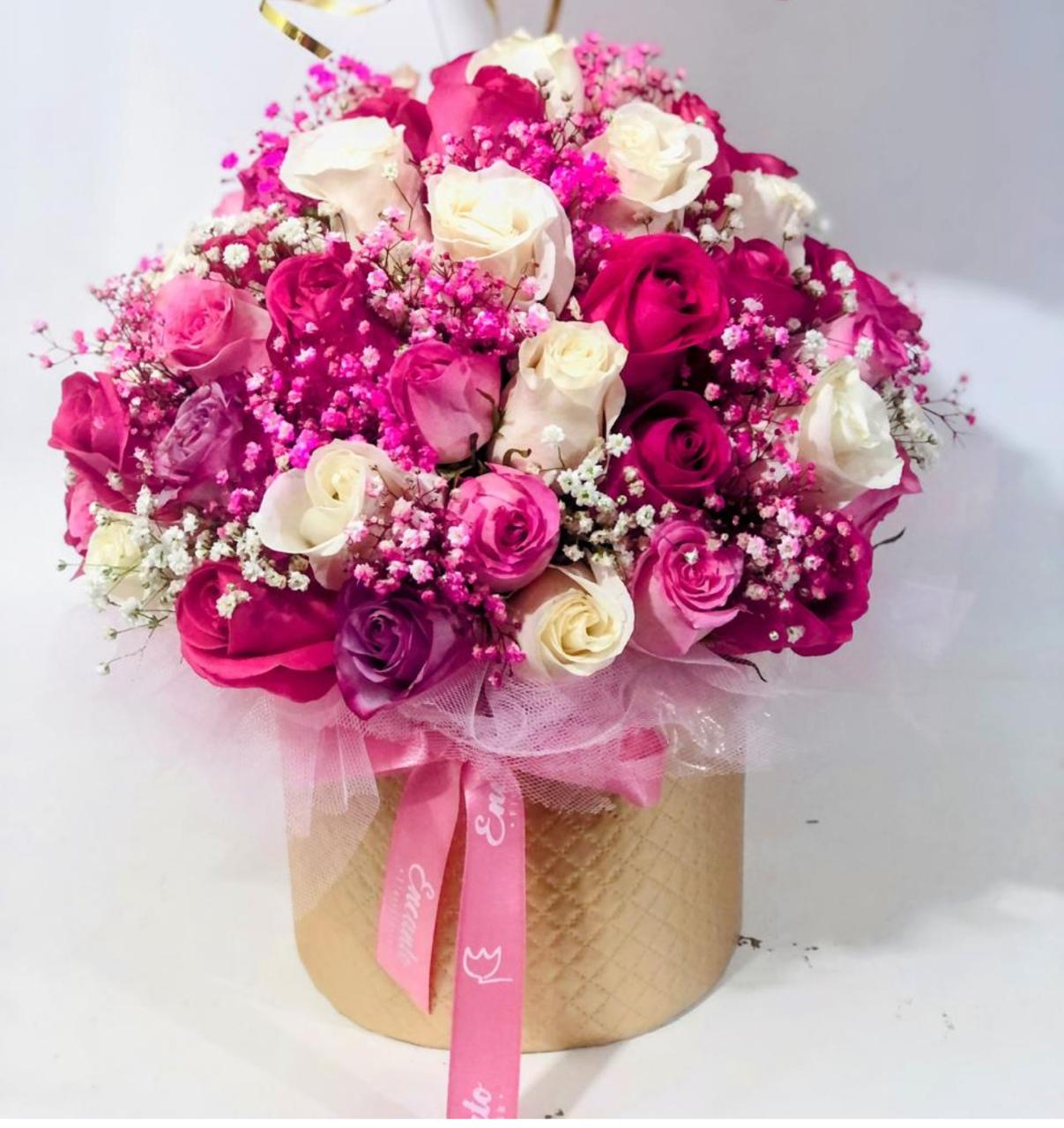 Caja dura con un lazo de raso con 45- 48 rosas blancas rosadas y fucsias, yipsophilia tules