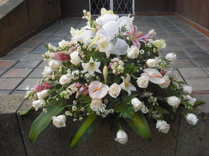Arreglo floral en forma ovalado, con 24-26 rosas blancas, anturios u hortensias, bocas de dragón, lirios, montecasinos, helecho cuero, ruscus, hojas de dracena, y un granmoño en cinta spider.