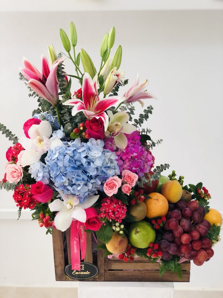 Base con dos divisiones, una para el arreglo en 3 varas de lirios , 2hortensias, 8 rosas coloridas, 3 orquideas cinvidium, yipsis, eucaliptos, ruscus, hipericos. Y otra donde lleva dispuestas las frutas: uvas,manzas verde y roja, grandillas, pera, durazno, kiwi, hipericos