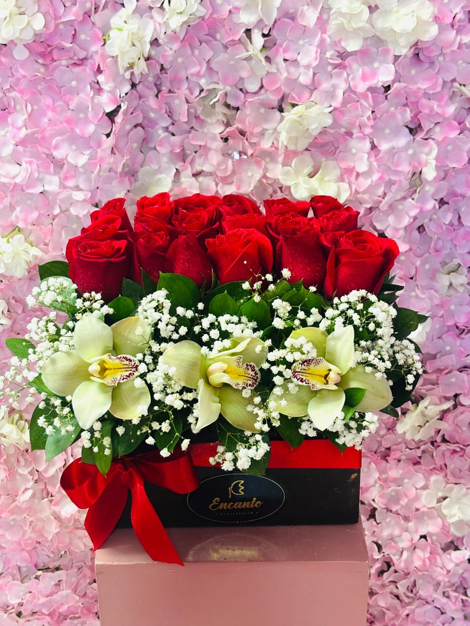 Base rectangular de madera rústica, conmoño de raso, 18 rosas rojas a nivel, 3 orquideas, rusco yipsophilias.