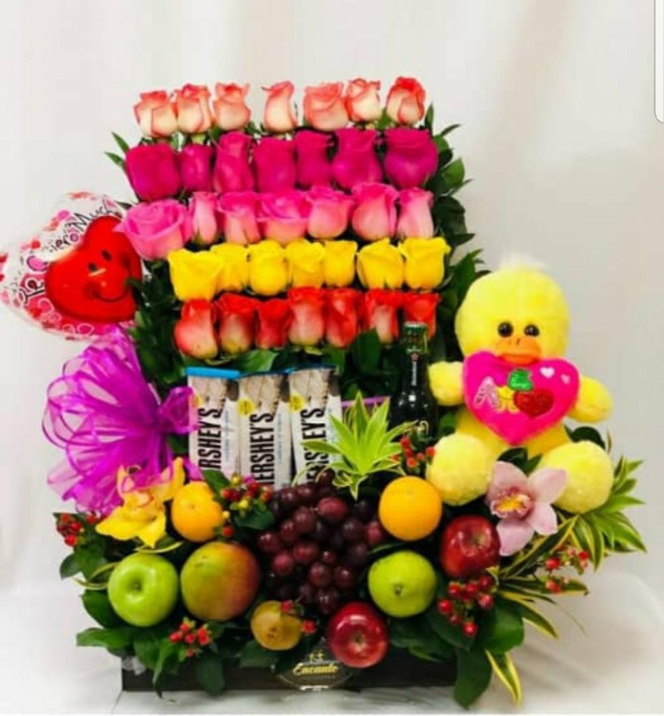 35 rosas de colores vivos, en escalera, y enla base de madera lleva uvas, manzanas, granadillas, pera, durazno, 3 chocolatinas hershys, una cerveza, un peluche, un globo, un moño alrededor de las rosas, 2 orquideas cinvidium