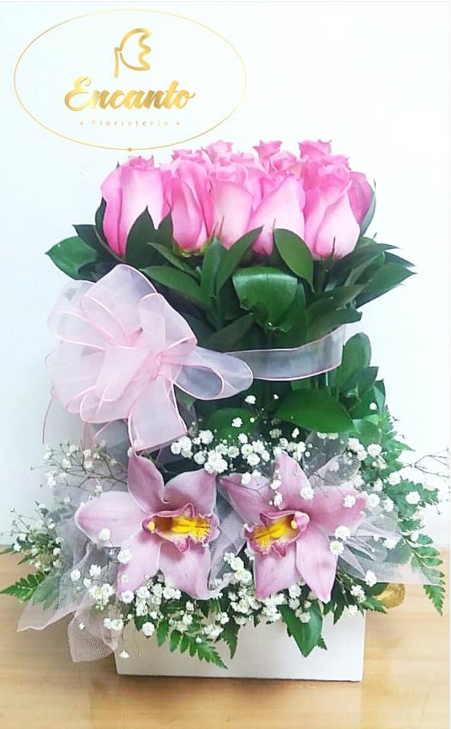 15 Rosas rosadas al mismo nivel, con un lazo terminado en moño en cinta de raso amarrando las rosas y 2 orquideas cinvidium con follajes y yipsophilias