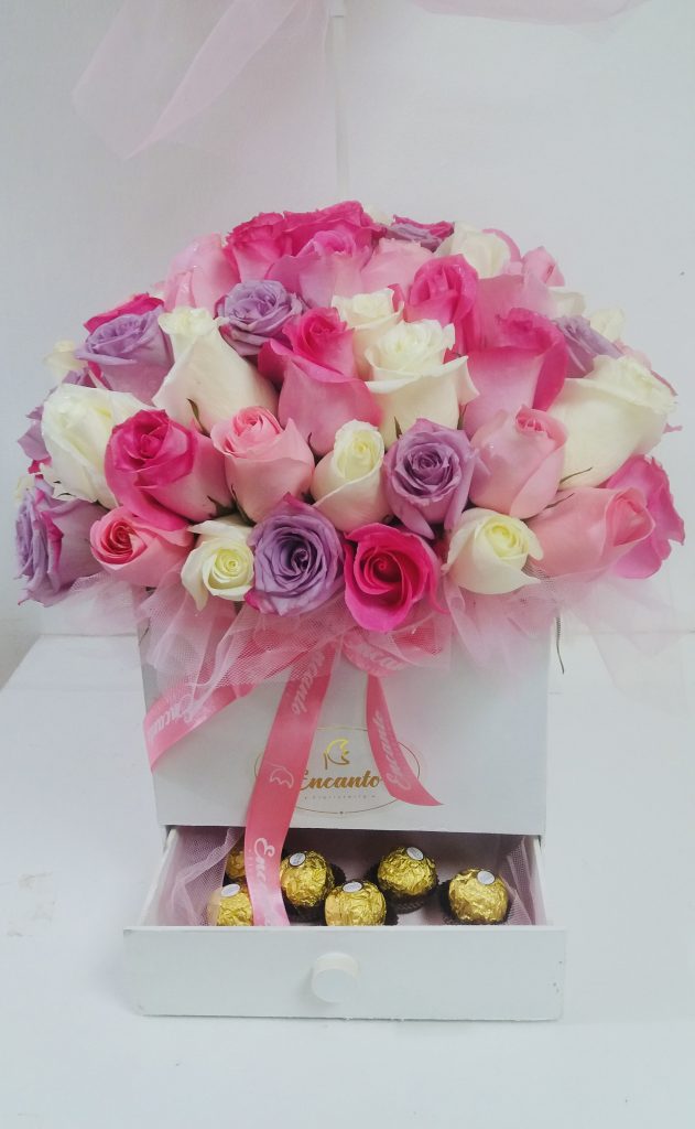 Cofre de madera con un lazo en cinta de raso con 48-50 rosas entre rosadas lilas y blancas , tules, y 9 deliciosos chocolates ferrero rocher