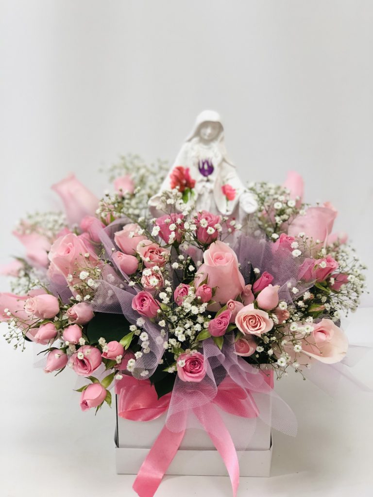 Caja dura con una bella virgencita en el centro del arreglo , botones de rosas grandes , rosas minis, tules, yipsophilias, finos follajes la caja decorada con un moño en raso colores rosados